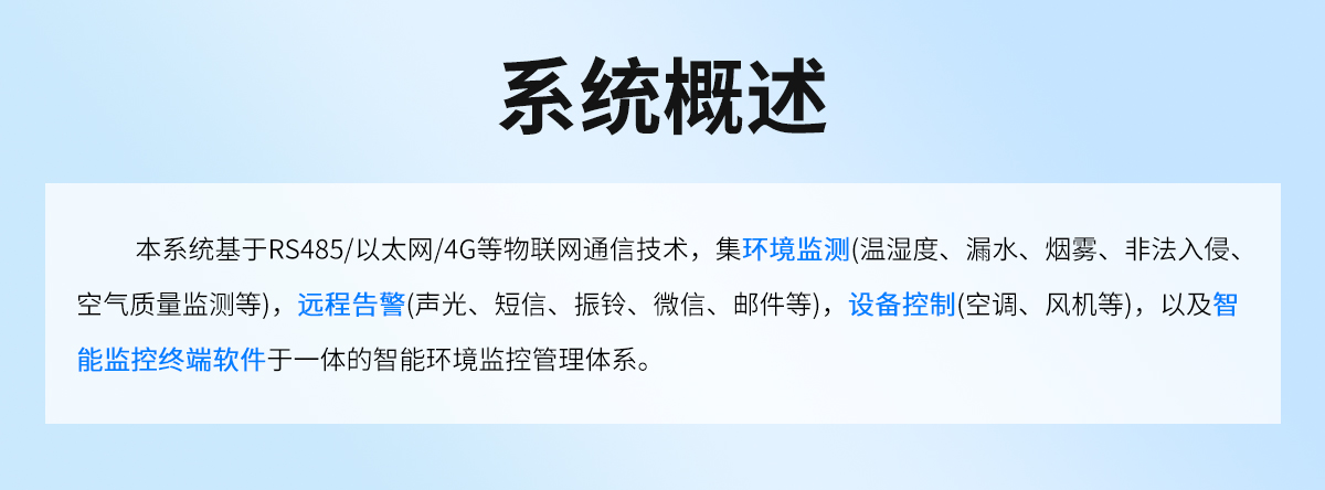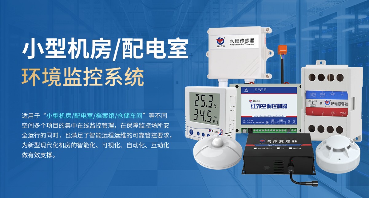 小型机房/配电室环境监控系统通过对机房内的温湿度、漏水、烟雾、红外入侵、空气质量等进行监控,建立一套较为完整的机房环境监控、动力监控、安防监控的管理体系。通过设立统一监控管理站,对分布在机房不同区域的多个设备和信息进行全数字化集中监控管理,实现机房的少人或无人值守,满足现代化机房管理的需要。