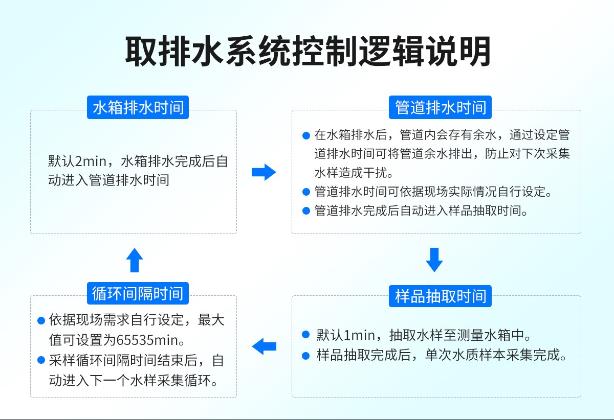 机柜式取水监测平台整体由取水系统、监测系统及显示系统三部分组成 ,其内置的“自动取水、储水、排水”的开流系统,在实现“自动定时循环更换水质样本”的同时,还排除了流速对于传感器的影响,大大提升了检测结果的稳定性,延长了传感器的使用寿命。