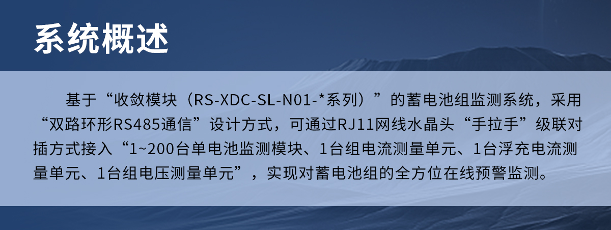 基于“收敛模块”的蓄电池组监测系统,采用“双路环形RS485通信”设计方式,可通过RJ11网线水晶头“手拉手”级联对插方式接入“1~200台单电池监测模块、1台组电流测量单元、1台浮充电流测量单元、1台组电压测量单元”,实现对蓄电池组的全方位在线预警监测。