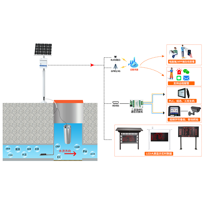 窨井地下水立杆式监测站是掌握地下水变化规律、了解地下水开采状况、指导地下水资源保护的重要手段。该系统可以对自然河流、水库、水源地等地表水及地下水的水质(水位、水温、电导率、PH、溶解氧、浊度、氨氮、总磷、余氯、COD等)实时在线动态监测,实现水质数据的自动存储监测、对地下水的变化规律进行动态分析。