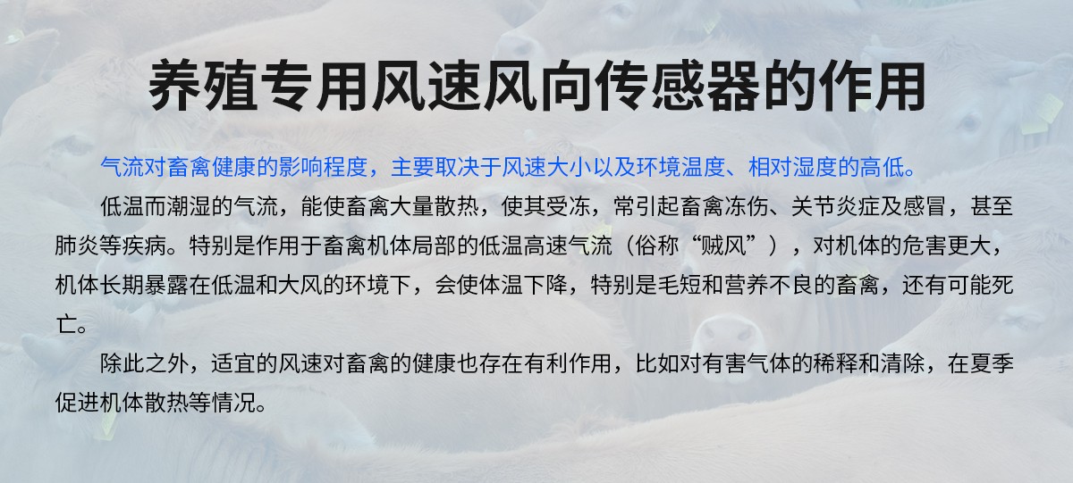 气流对畜禽健康的影响程度,主要取决于风速大小以及环境温度、相对湿度的高低。低温而潮湿的气流,能使畜禽大量散热,使其受冻,常引起畜禽冻伤、关节炎症及感冒,甚至肺炎等疾病。通过对养殖场内的风速要素进行实时监测与调控,为养殖场内动物提供更为舒适、健康的生长环境。