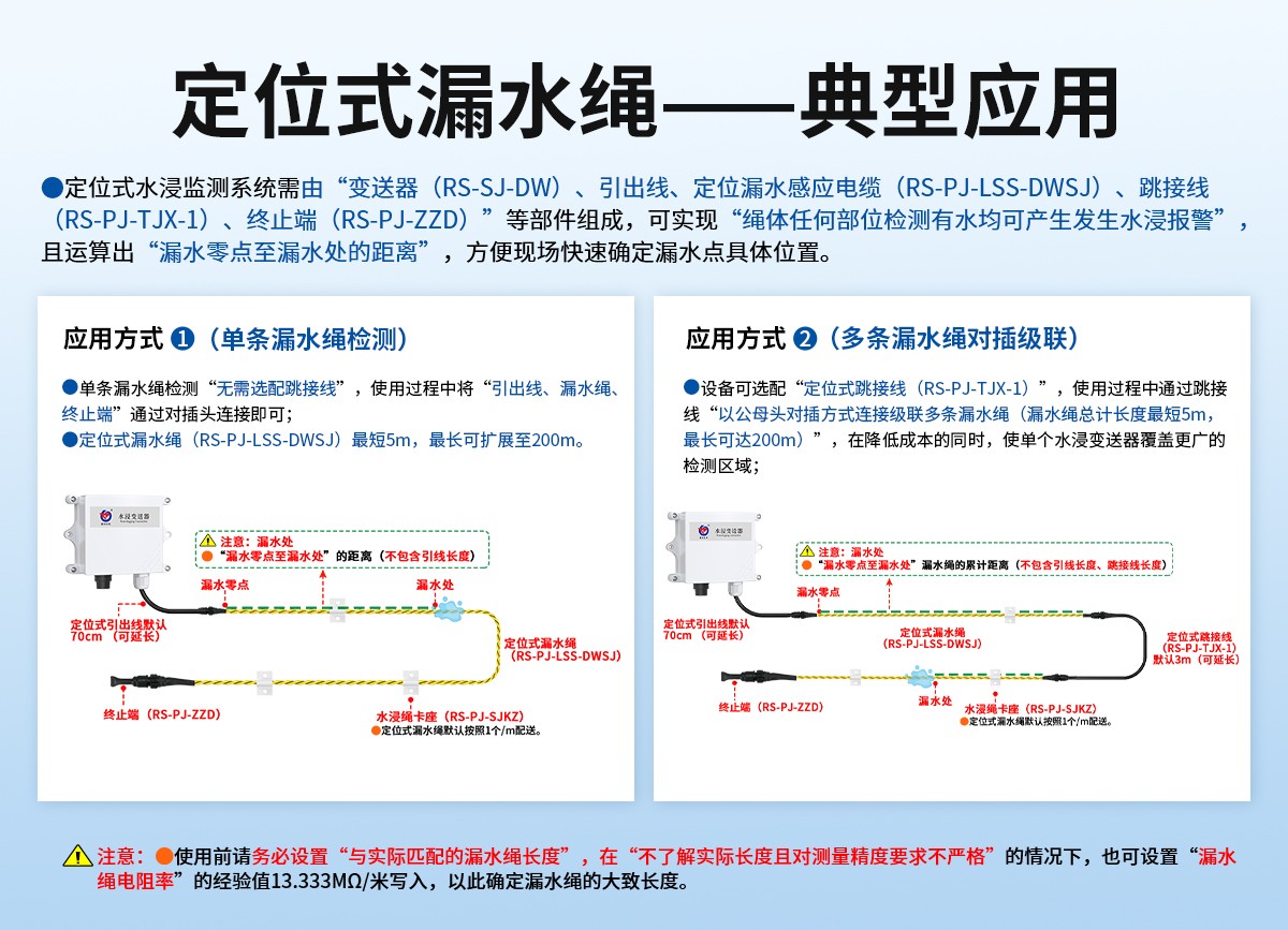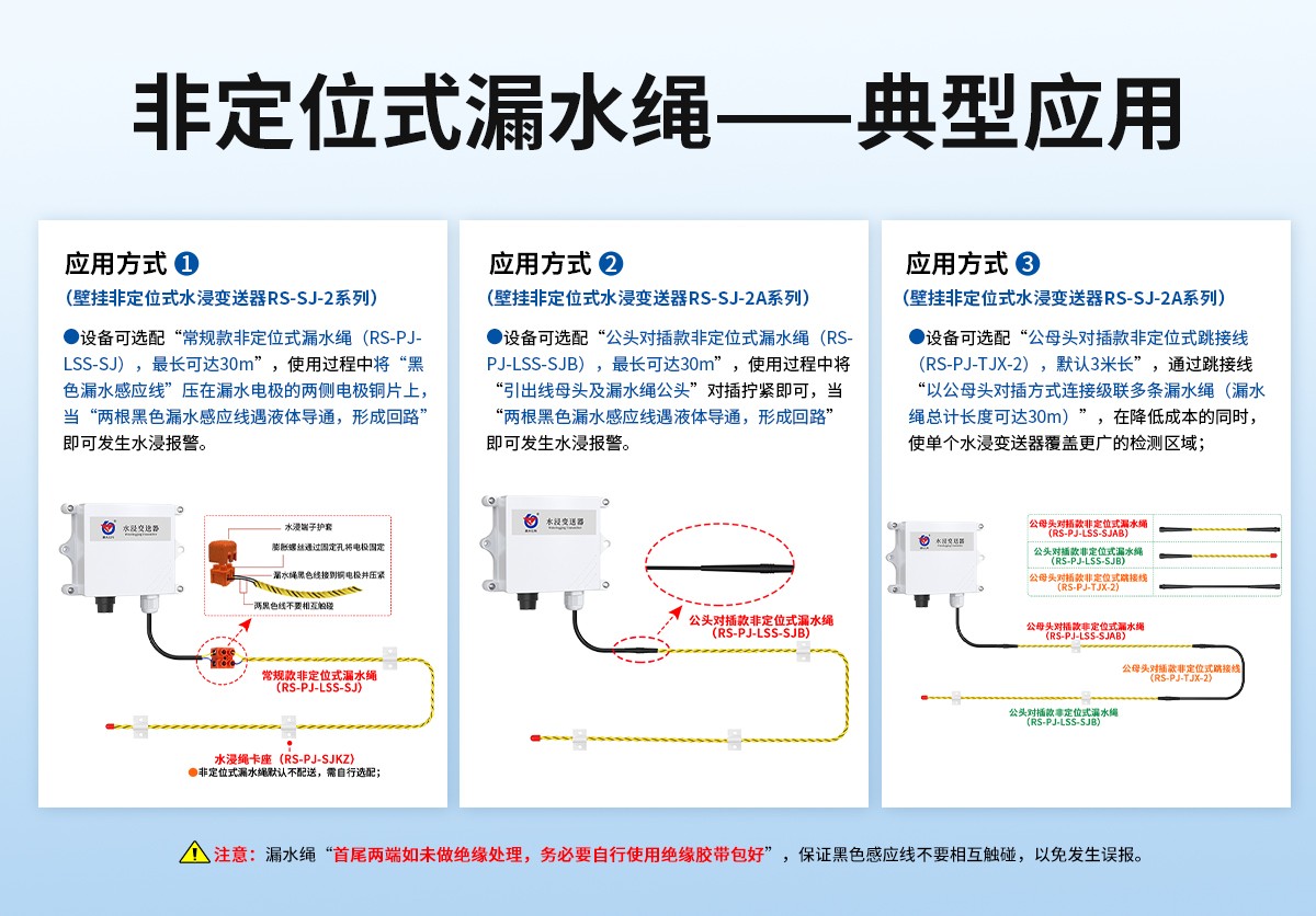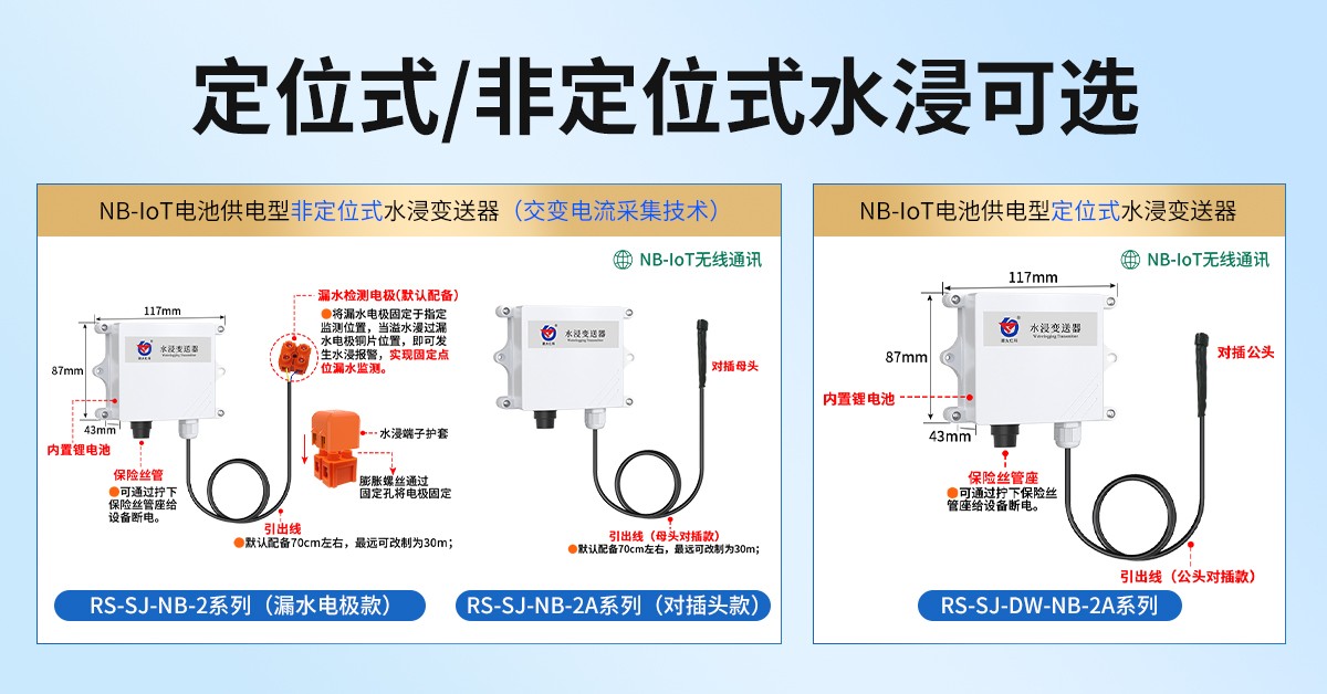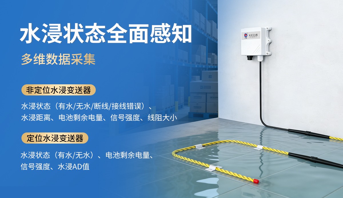 可选配定位式或非定位式水浸变送器,设备内置大容量锂电池,可通过NB组网通讯方式,实现对“水浸状态(有水/无水/断线/接线错误)、水浸距离、电池剩余电量、信号强度、线阻大小”的在线监测,适用于数据中心、智慧楼宇、仓库、机房等需要无人值守、预防水患风险的场景,实现对漏水隐患的早期发现与智能化管理。