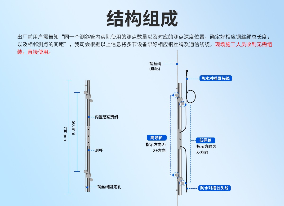 内部位移监测站以固定式测斜仪为核心,采用重力加速度传感器作为敏感元件,测量精度高,能实现倾斜测量的自动化,在一个钻孔内安装多个固定测斜仪,可以更加准确的监测倾斜变化,是一款工程施工监测必备的精密测量仪器。
