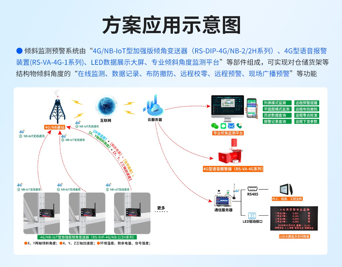 货架倾斜监测预警系统,是破解传统人工巡检频次低、误差大、盲区多等痛点的核心手段。我公司所研发生产的“倾斜监测预警系统”已应用于多个地区重点项目的仓储货架智能化改造,为各类仓储场景的安全管理需求提供了可落地的参考依据,助力仓储运营实现安全化、智能化升级。