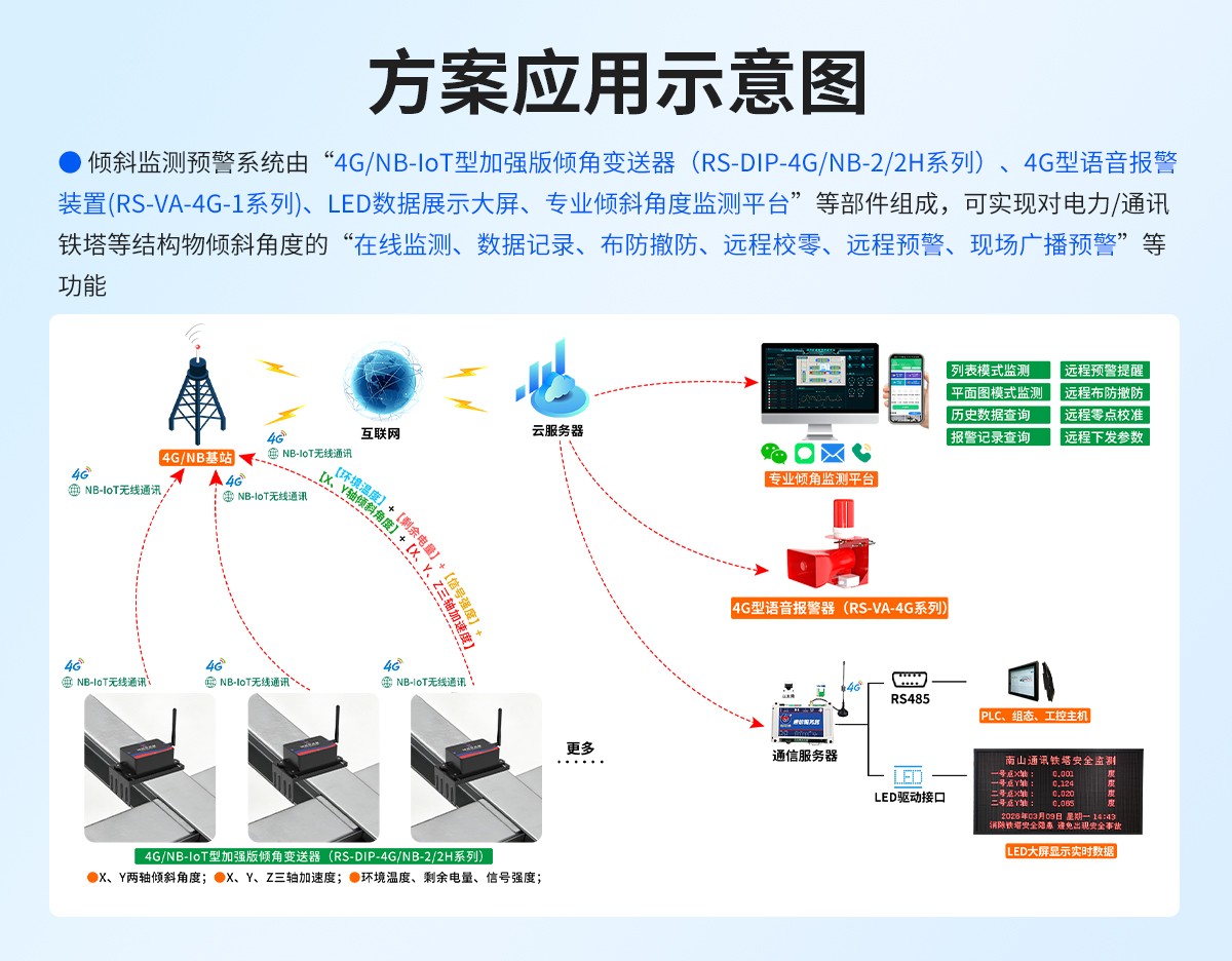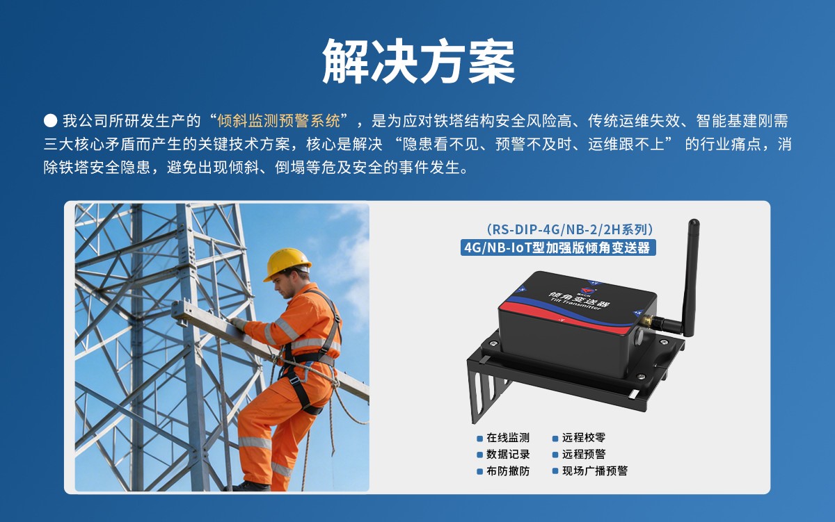 电力/通讯铁塔倾斜监测预警系统,是为应对铁塔结构安全风险高、传统运维失效、智能基建刚需三大核心矛盾而产生的关键技术方案,核心是解决“隐患看不见、预警不及时、运维跟不上”的行业痛点,消除铁塔安全隐患,避免出现倾斜、倒塌等危及安全的事件发生。
