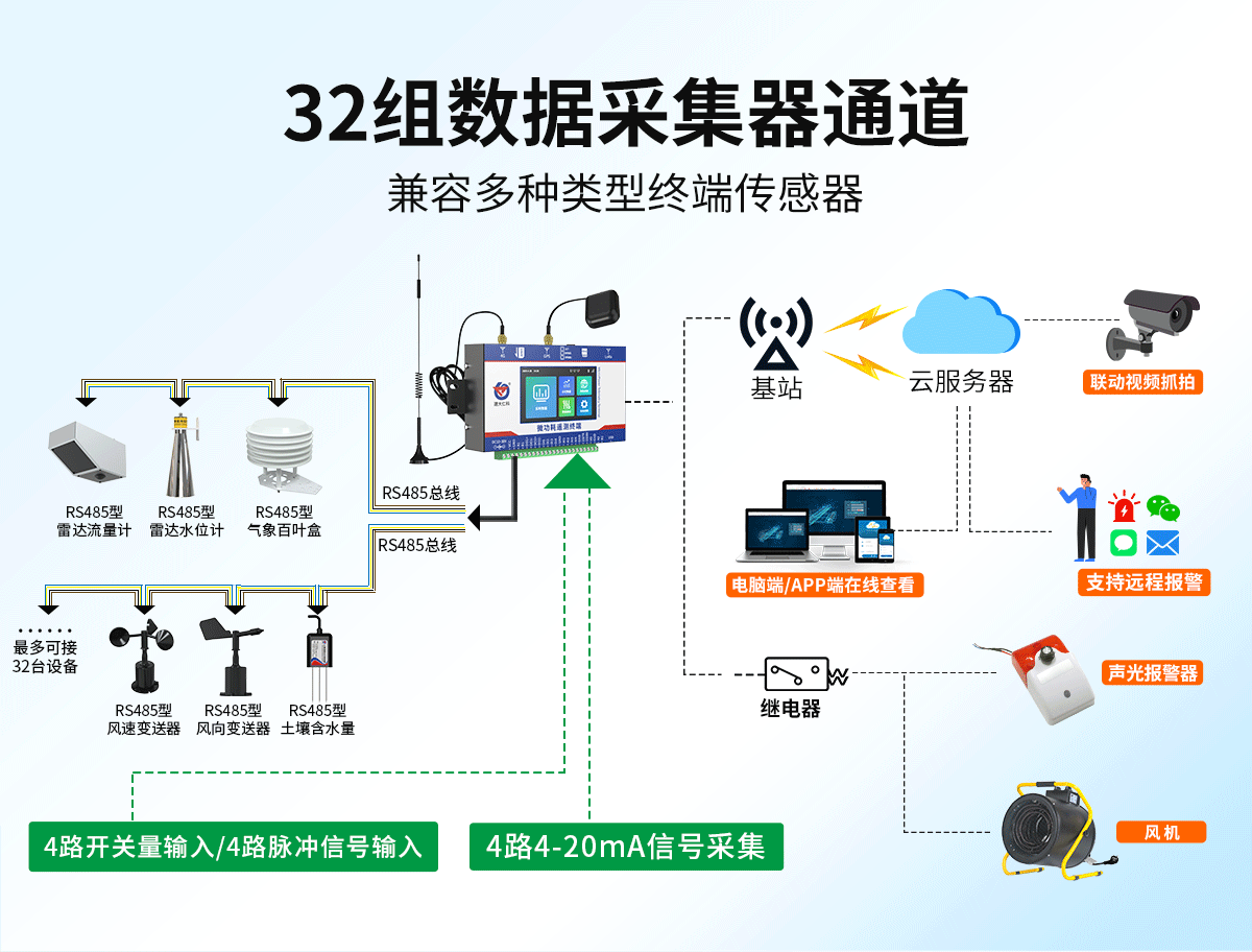 | 4路开关量输入通道 | 可检测干接点通断状态 | 可采集开关量或脉冲计数(外接电表使用);第四路可外接脉冲雨量计 |