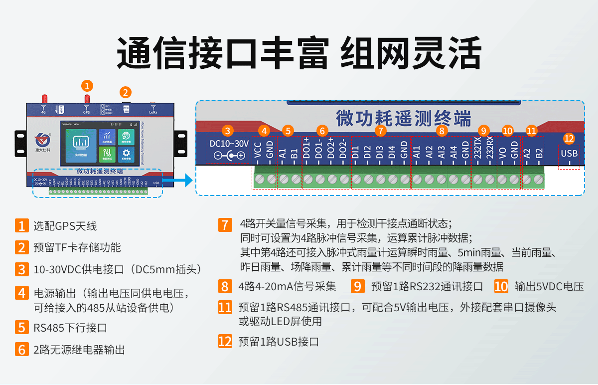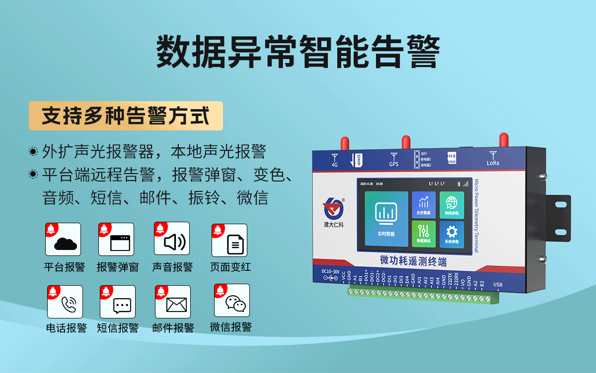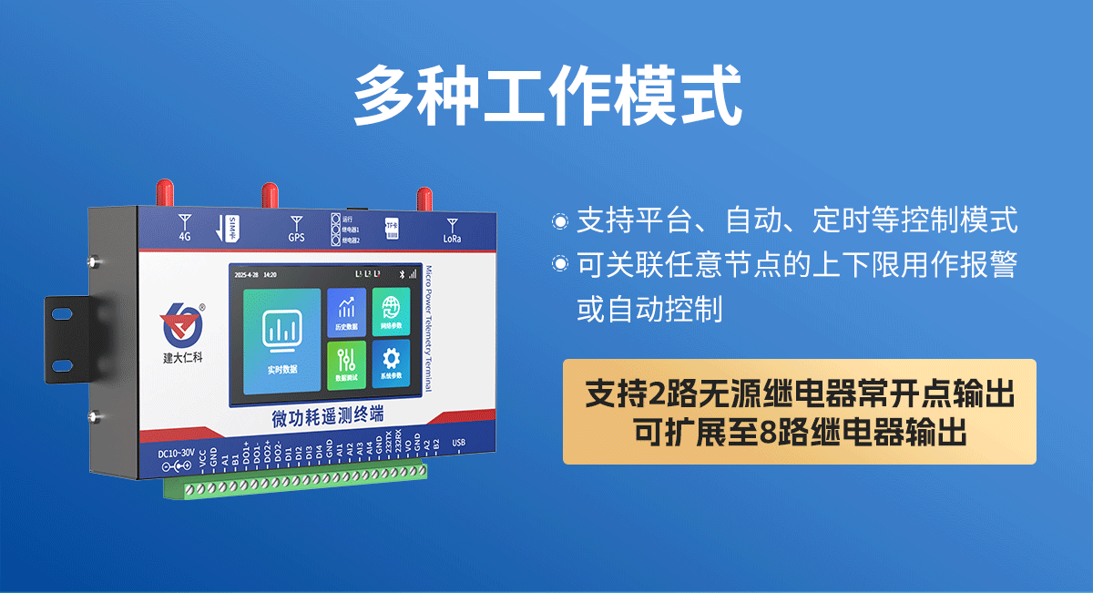 微功耗遥测终端专为环境监控系统“远程数据采集与传输”设计的一款高效工业物联网终端机,拥有丰富的下行通信接口,可兼容采集“多种类型终端传感器”的测定数据