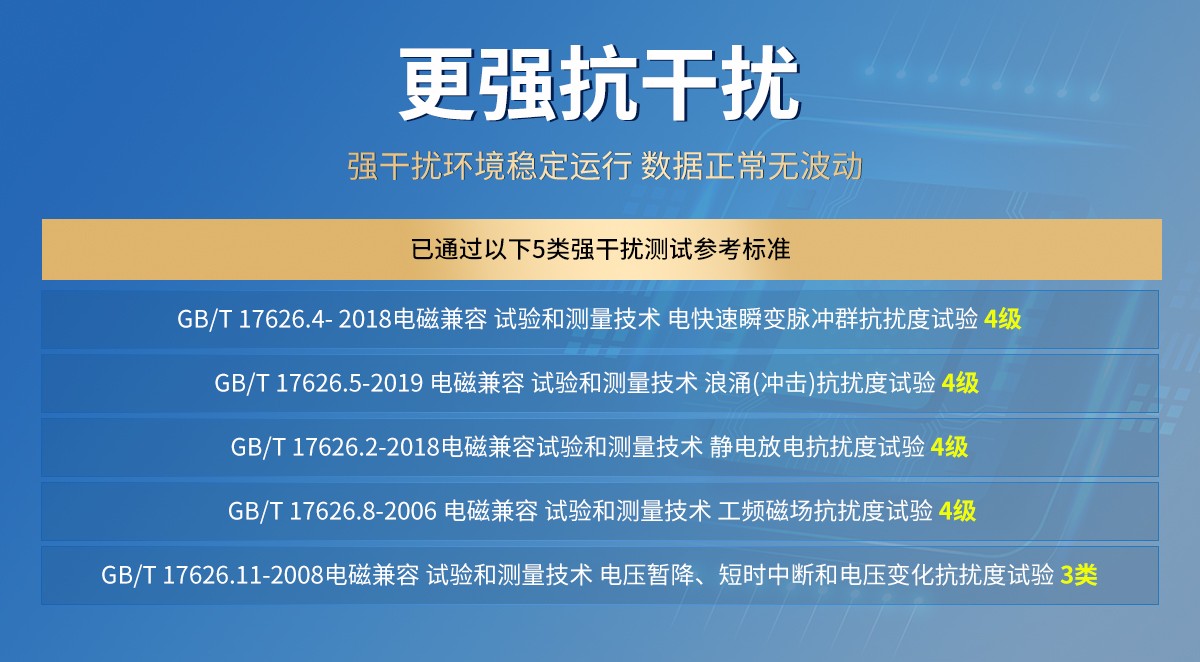 | 电磁兼容等级 | GB/T 17626.4- 2018 电磁兼容 试验和测量技术 电快速瞬变脉冲群抗扰度试验 4级 GB/T 17626.5- 2019 电磁兼容 试验和测量技术 浪涌(冲击)抗扰度试验 4级 GB/T 17626.2- 2018 电磁兼容 试验和测量技术 静电放电抗扰度试验 4级 GB/T 17626.8- 2006 电磁兼容 试验和测量技术 工频磁场抗扰度试验 5级 GB/T 17626.11-2008电磁兼容 试验和测量技术 电压暂降、短时中断和电压变化抗扰度试验 3类 | |