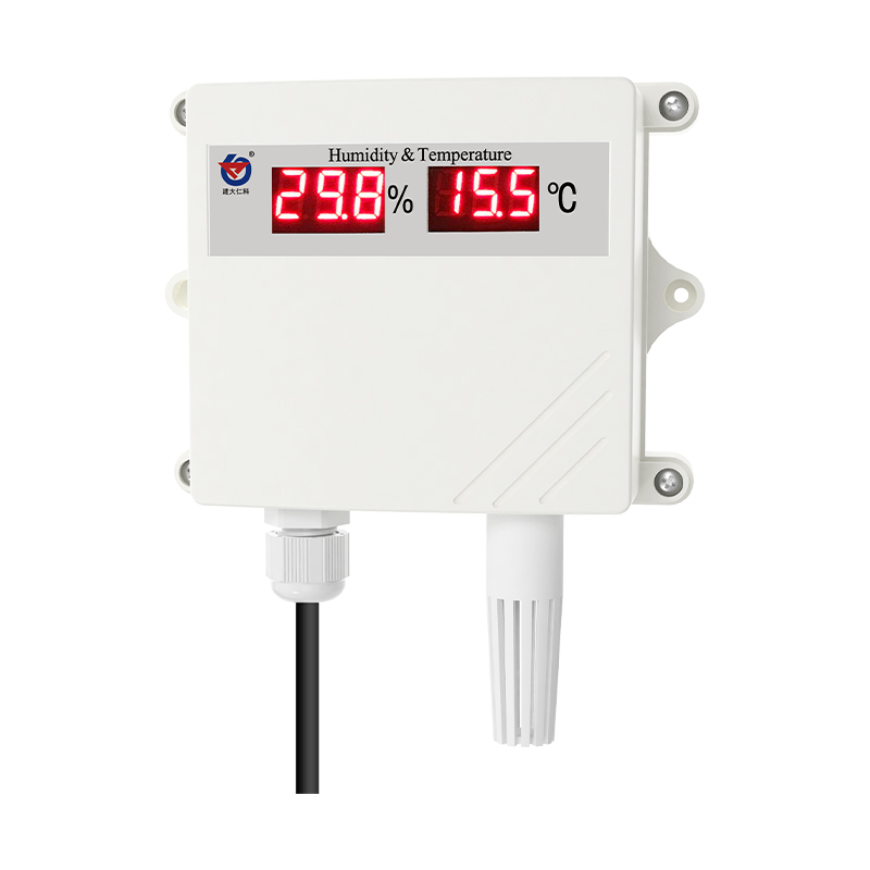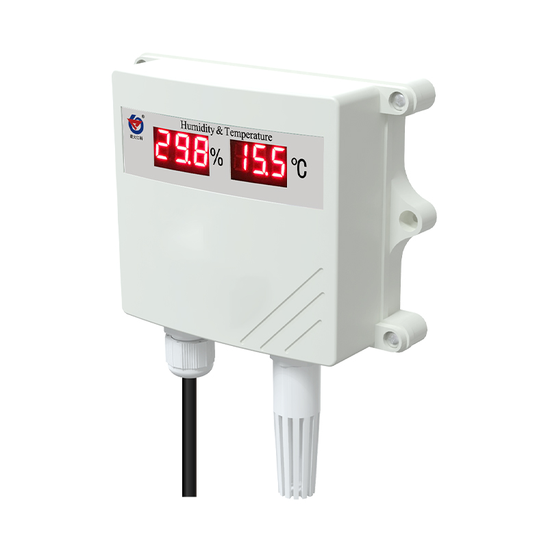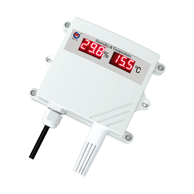 本产品采用高亮数码管实时显示当前温度湿度,壁挂高防护外壳,防护等级 IP65,防雨雪且透气性好,支持多种外延探头类型,采用颗粒烧结探头护套,探头与壳体直接相连外观美观大方。RS485信号输出,最远可通信 2000 米,标准ModBus-RTU 协议,支持二次开发。