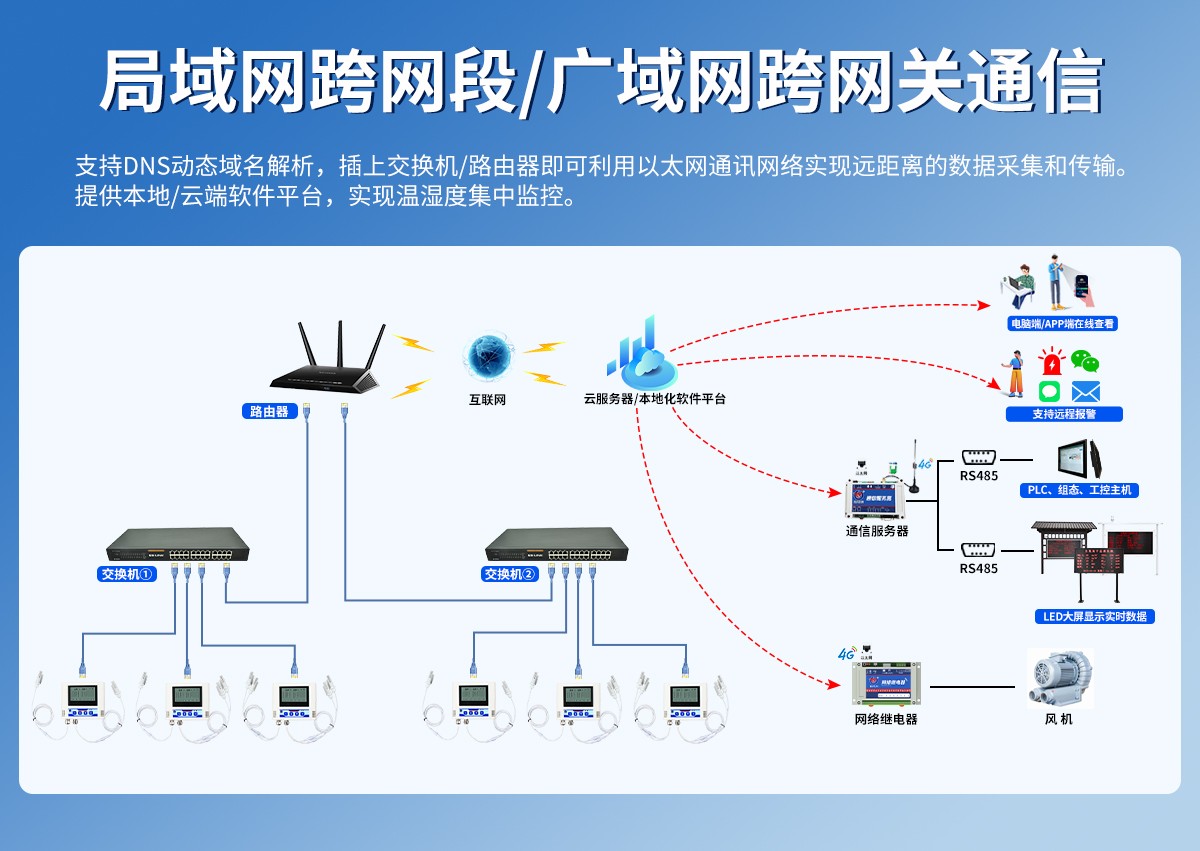以太网多探头型温湿度变送器是一款基于网口传输的工业级温湿度变送器,支持2~4路温湿度监测同步监测,插上交换机/路由器即可利用以太网通讯网络实现远距离的数据采集和传输。提供监测软件平台,实现温湿度集中监控。支持局域网跨网段/广域网跨网关通信,支持DNS动态域名解析。