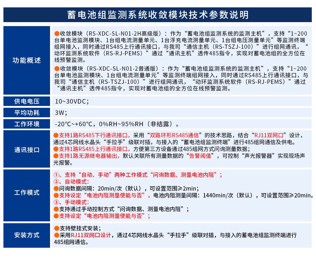 基于“收敛模块”的蓄电池组监测系统,采用“双路环形RS485通信”设计方式,可通过RJ11网线水晶头“手拉手”级联对插方式接入“1~200台单电池监测模块、1台组电流测量单元、1台浮充电流测量单元、1台组电压测量单元”,实现对蓄电池组的全方位在线预警监测。