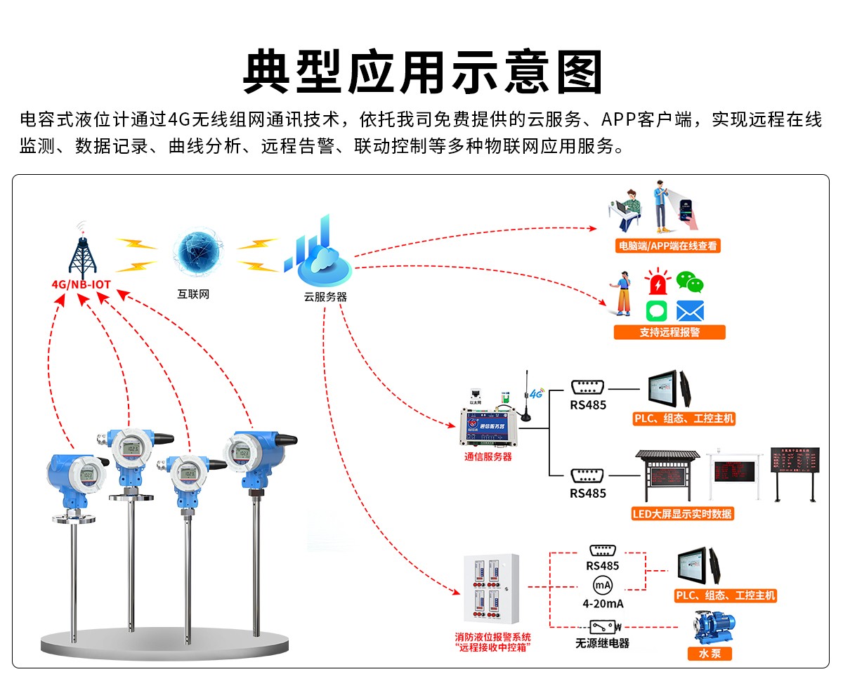 4G 型电容式液位计,采用射频导纳液位传感器,可将液位变化转化为4G信号,并上传至我公司免费的云平台或本地平台。产品体积小巧,易于安装,采用不锈钢外壳隔离防腐,适于测量与接触部分材质相兼容的液体介质。 自带显示屏,现场可直接查看数值,也可通过本地按键配置。可存储12万条数据。