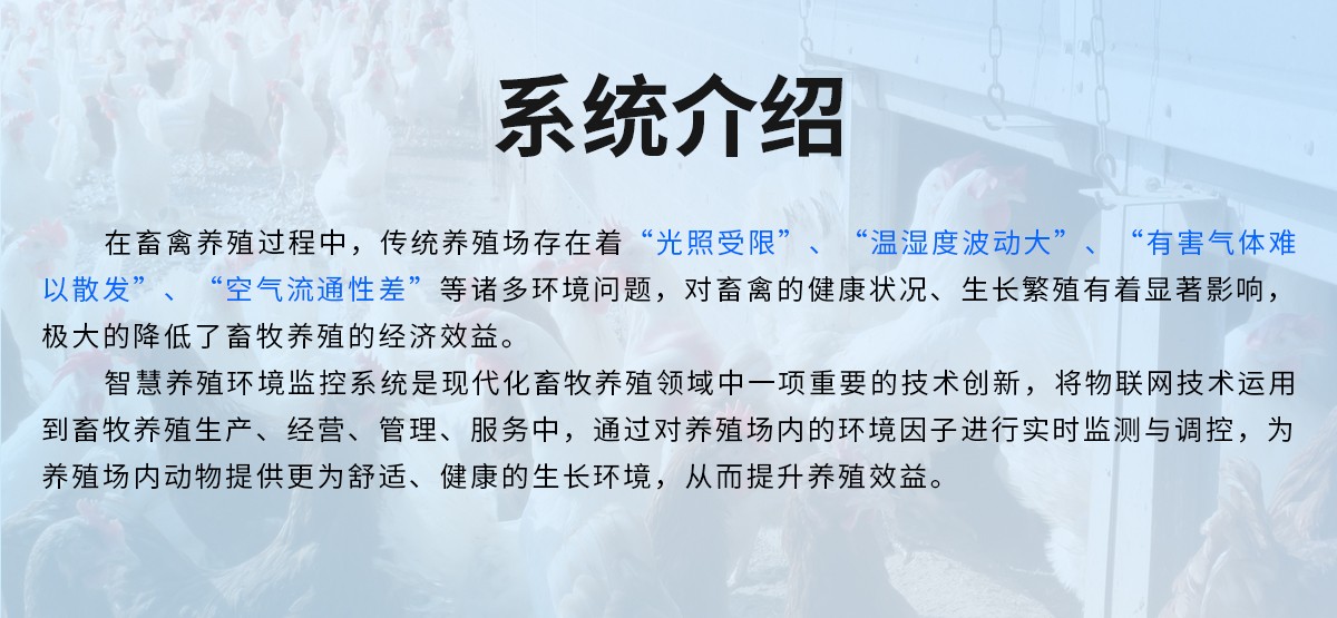 智慧养殖环境监控系统,采用RS485组网通信形式,系统可扩展“温湿度、氨气、硫化氢、二氧化碳、光照强度、风速、压差”等多种传感器,依托我司免费提供的云服务、APP客户端,可实现远程在线监测、数据记录、曲线分析、远程告警、联动控制等多种物联网应用服务。